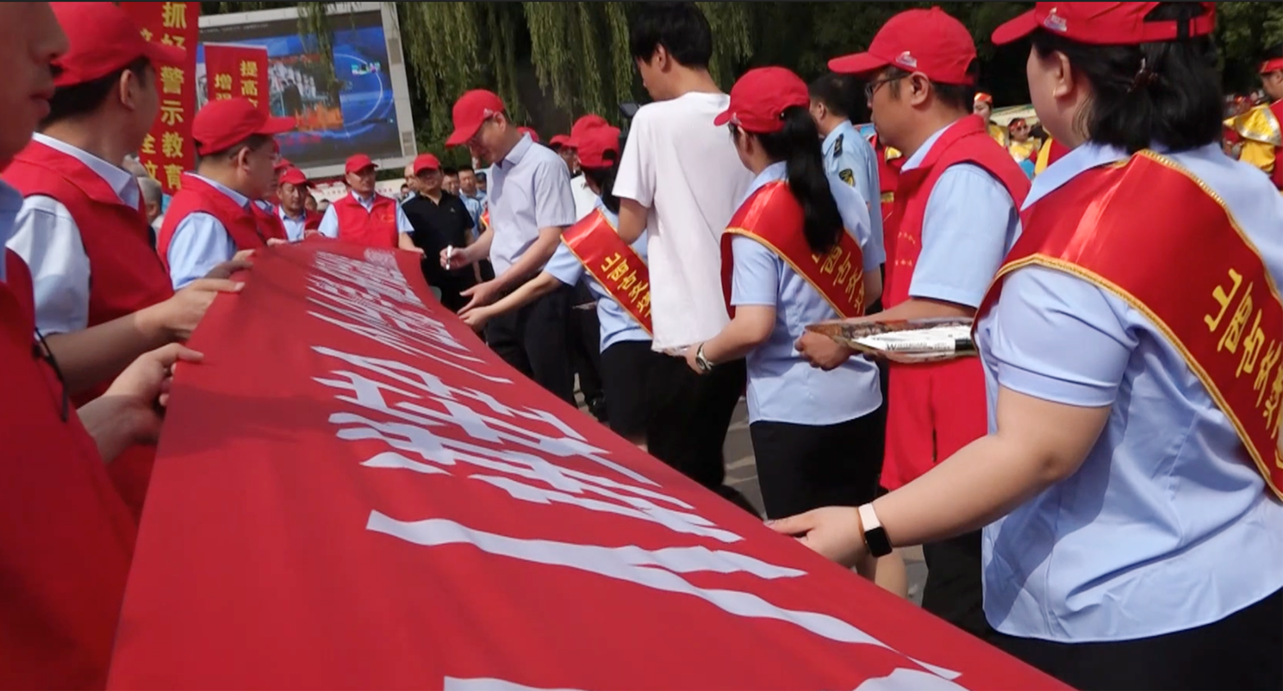 古交市領(lǐng)導(dǎo)周飛、郝平貴、郭永峰、弓文慧、張慧忠在印有活動主題的橫幅上簽名。